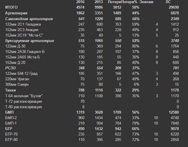 За два года войны на Донбассе украинская армия потеряла 50% самоходных артиллерийских систем, 52% буксируемой артиллерии, 37% реактивных систем залпового огня, 29% танков и 56% БМП различных модификаций.