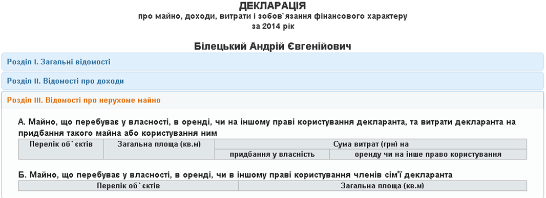 Не мог Билецкий получить недостающие средства и в начале 2015 года, поскольку отразил в своей декларации доход от депутатской зарплаты в сумме 59 тыс гривен за весь год: