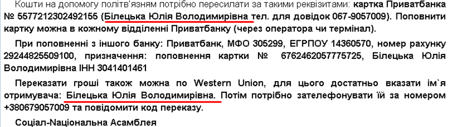 Из открытых источников мы узнали, что жену «Белого Вождя» (как называют Билецкого некоторые его сторонники) зовут Юлия Владимировна. На ее имя в 2012-2013 годах националисты собирали средства, когда Билецкий находился под арестом в харьковском СИЗО: