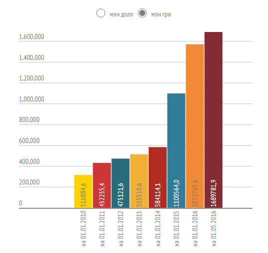 В гривневом эквиваленте эта сумма составляет 1,690 триллиона. По сравнению с 2010 годом (0,3168846 триллиона) долг увеличился более чем в 5 раз.
