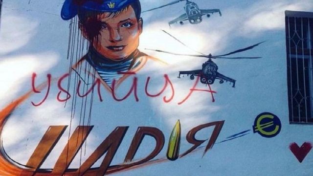 Савченко изображена на фоне двух вертолетов. Над ее портретом красными буквами жители написали "убийца".