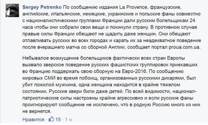 Более того, по мнению последователей идей Пономаря, за дракой В Ницце между болельщиками из Польши и Северной Ирландии, также стоят русские. Украинские пользователи с уверенность объявляют, что отчетливо слышат русский акцент на видео драки.