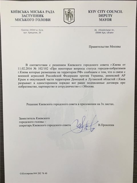 Не так давно, в середине мая 2016 года, киевский горсовет направил в правительство Москвы уведомление, что отныне Киев не считает себя городом -побратимом российской столице.