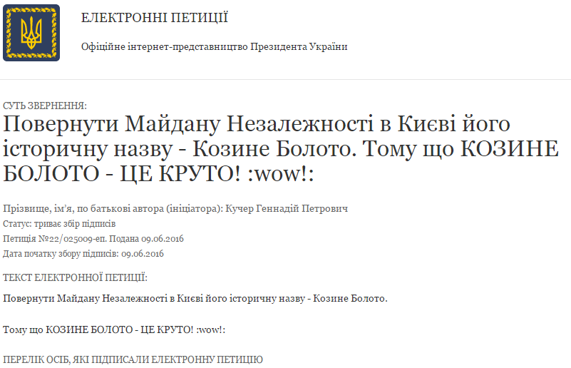 На веб-сайте Официального интернет-представительства Президента Украины размещена петиция с требованием вернуть майдану Незалежности его историческое название - Козье Болото.