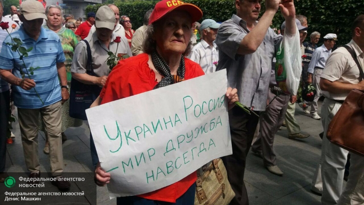 Лозунги на плакатах красноречивы: «75 лет агрессии нацистского зверья, 75 лет подвигу советского народа», «За нашу советскую родину!», «Никто не забыт, ничто не забыто!». Цепляет взгляд самодельный плакат «Украина и Россия – мир, дружба навсегда!» в руках у немолодой женщины.