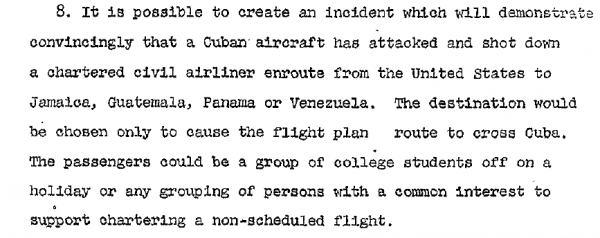 «Можно создать инцидент, который убедительно продемонстрирует, как кубинский самолёт атаковал и сбил чартерный гражданский лайнер, направляющийся из США в Ямайку, Гватемалу, Панаму или Венесуэлу. Направление выбирается так, чтобы пересечь Кубу. Пассажирами могут быть студенты или любая другая группа людей с общими интересами, чтобы оправдать использование чартерного рейса вне расписания».