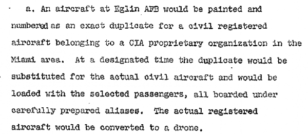«На базе ВВС США «Эглин» будет подготовлен самолет,покрашенный и пронумерованный как точный двойник гражданского зарегистрированного самолета, принадлежащего организации под патронажем ЦРУ в Майами. В назначенное время самолет-дублер, заполненный специально отобранными пассажирами под тщательно подготовленными вымышленными именами, будет заменен на гражданский самолёт, управляемый дистанционно».