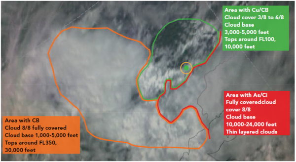 Фактическая обстановка по данным метеорологических служб из отчёта Комиссии.Зелёной точкой обозначено последнее положение самолёта, за ним идёт максимальная облачность – 8 из 8. Не похоже на совершенно ясное небо, не так ли?!