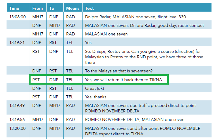 Самолёт вышел из транспортного коридора, причём диспетчеры решили попросить его туда вернуться. Если вдуматься в разговор с диспетчерами, то он даёт много почвы для сомнений в адекватности ситуации. Разговор Днепропетровска с MH17 начинается с обмена любезностями в 16:08 местного времени. После этого 12 минут Днепропетровск вообще никак не связывается с самолётом.