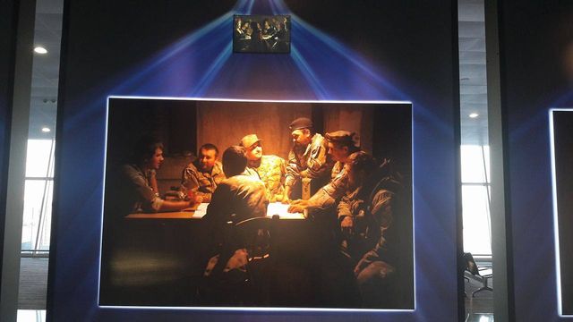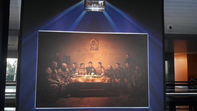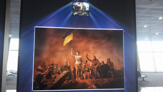 Прилетающих в сердце Украины через его воздушные ворота встречает пародия на "Тайную вечерю" Леонародо да Винчи с карателями АТО в виде апостолов. В роли "христа" в центр сидит быший священник Сергий Дмитриев, перебежавший к Филарету в период майдана. О нем рассказывали, что в свое время он гонялся за молоденькими алтарниками. В этом контексте ласковые взгляды, которые он бросает на "героев", а они - на него, прибавляет пикантности картинке.
