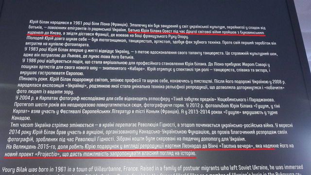 Из пикантного: и к обильно раздаваемых самим Юрием Билаком интревью, и в каталоге (фото ниже), размещенном в терминале D аэропорта "Борисполь", где сейчас экспонируется эта выставка, с гордостью говорится, что его отец - гуцул из Выжницы, пришел в Киев в составе Буковинского куреня в начале Великой Отечественной войны. Напомню, что именно члены Буковинского куреня были палачами Бабьего Яра. Как видите, теперь на Украине заезжие эмиссары не стесняются сознаваться, что их предки были соучастниками Холокоста на Украине... И такие люди теперь навязывают через геббель-СМИ рядовым украинцам "свое видение истории Украины", как он подчеркивает...