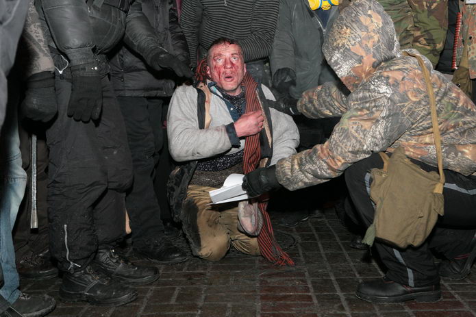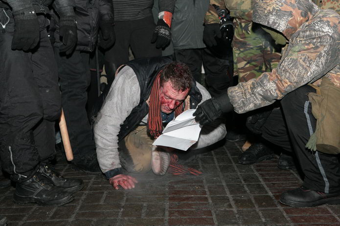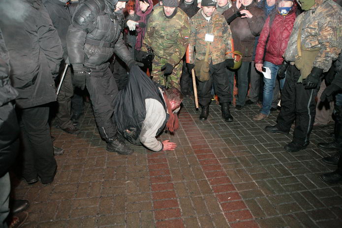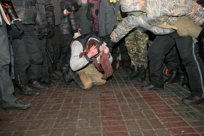По Крещатику — мимо витрин и огней, мимо прохожих и палаток с протестующими — волокли человека.