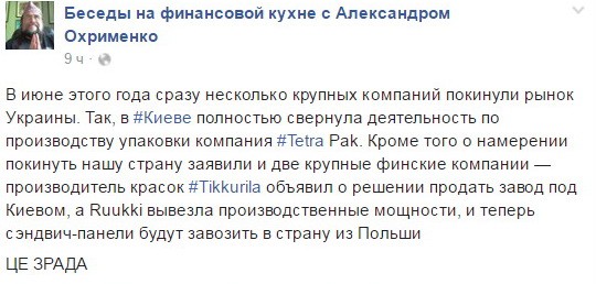 “В июне этого года сразу несколько крупных компаний покинули рынок Украины. Так, в Киеве полностью свернула деятельность по производству упаковки компания Tetra Pak. Кроме того о намерении покинуть нашу страну заявили и две крупные финские компании — производитель красок Tikkurila объявил о решении продать завод под Киевом, а Ruukki вывезла производственные мощности, и теперь сэндвич-панели будут завозить в страну из Польши. ЦЕ ЗРАДА”, – написал экономист.