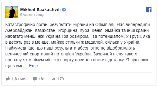 После катастрофически плохих результатов Украины на Олимпийских играх в Бразилии министр молодёжи и спорта Украины должен подать в отставку. Такое заявление сделал глава Одесской областной государственной администрации Михаил Саакашвили в своём Facebook.