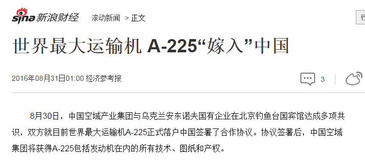 30 августа китайская компания China airspace и украинское госпредприятие «Антонов» подписали договор о сотрудничестве. Согласно договору к Китаю переходит право собственности на гигантский самолет-транспортёр АН-225, включая использование чертежей и спецификаций самолета. Переговоры по привлечению китайских инвесторов велись еще в мае 2016 года. После подписания договора с украинской компанией, Китай получил доступ к уникальным технологиям в области авиастроения. Планируется, что первый китайский АН-225 уже будет выпущен в первой половине 2019 года. АН-225 «Мрия» (в переводе с украинского - «мечта») является самым тяжёлым грузоподъёмным самолётом, когда-либо поднимавшимся в воздух. АН-225 был специально спроектирован для создания авиационной транспортной системы для проекта советского многоразового космического корабля «Буран». Самолет существует в единственном экземпляре.