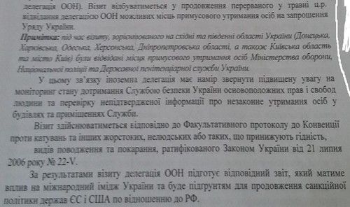 Есть и примечание, в котором говорится, что до сведения делегации ООН официально доведено, что единственным местом в СБУ, в котором содержатся или могут содержаться под стражей задержанные лица, является изолятор временного содержания Отдела обеспечения досудебного следствия по адресу: г. Киев, пер. Аскольдов, 3-А.