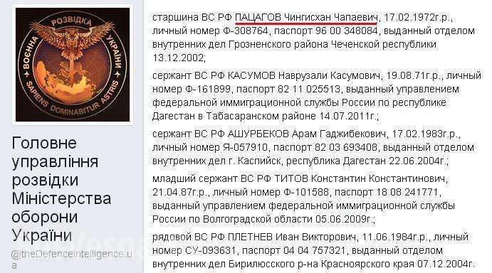 «Старшина ВС РФ ПАЦАГОВ Чингисхан Чапаевич, 17.02.1972г.р., личный номер Ф-308764, паспорт 96 00 348084, выданный отделом внутренних дел Грозненского района Чеченской республики 13.12.2002», — указано в сообщении ГУР МО Украины.
