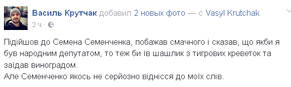 Журналист Василий Крутчак по долгу службы часто бывает в Верховной Раде Украины. Накануне он заглянул в столовую ВРУ, где увидел Семена Семенченко, который уплетал за обе щеки тигровые креветки и виноград.