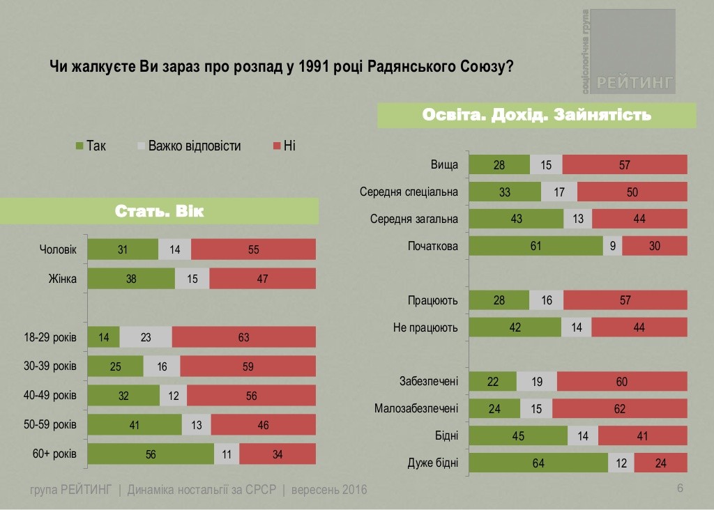Согласно результатам исследования, проведенного Социологической группой «Рейтинг» в сентябре 2016 года, треть (35%) опрошенных сожалеют о распаде в 1991 году Советского Союза, в то же время половина - нет, 15% - не определились.