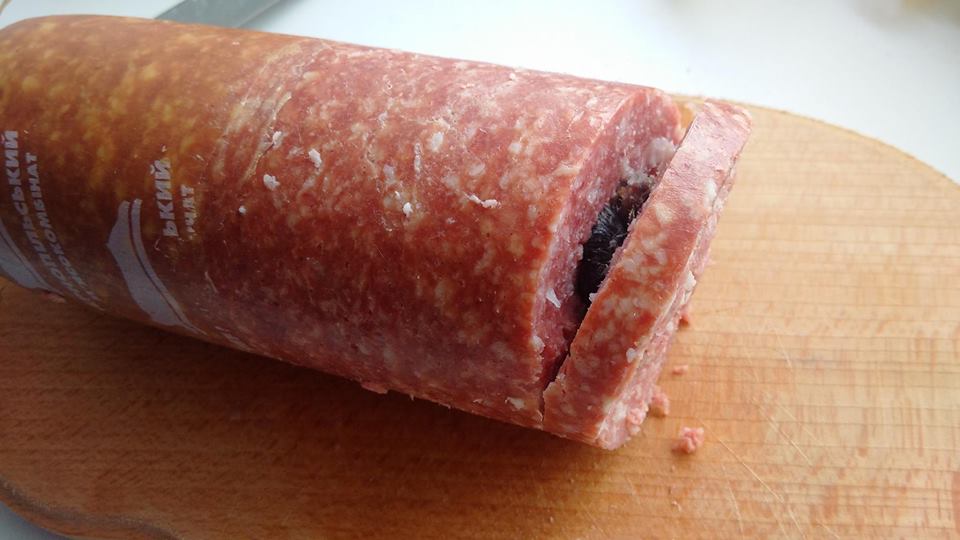 “У кого слабые нервы этот пост не смотреть!!! Детей уберите!!! Приезжал друг привез гостинцев от своих родственников. Вот так “вкусности”. Наверное после такого стану веганом. Какой-то бездомный песик на улице обрадовался такой манне небесной, пусть хоть ему радость. Потому что я второй день ничего не могу есть. Для справки – это колбаса с прекрасного города Тернополя, куплена в магазине “Барвинок”, чеки магазин не дает, находится в супермаркете, но именно за колбасные изделия платишь на месте, а потом уже все остальное – на обычной кассе на выходе. Колбаса же отпускается без чека – просто продавец себе в тетради записывает. По “целостности”, колбаса была целая, не на «отрез» и дополнительно была запечатана в прозрачном плотном герметичном пакете, маркером на котором было написано “довб” или что-то вроде этого “, – написал он.