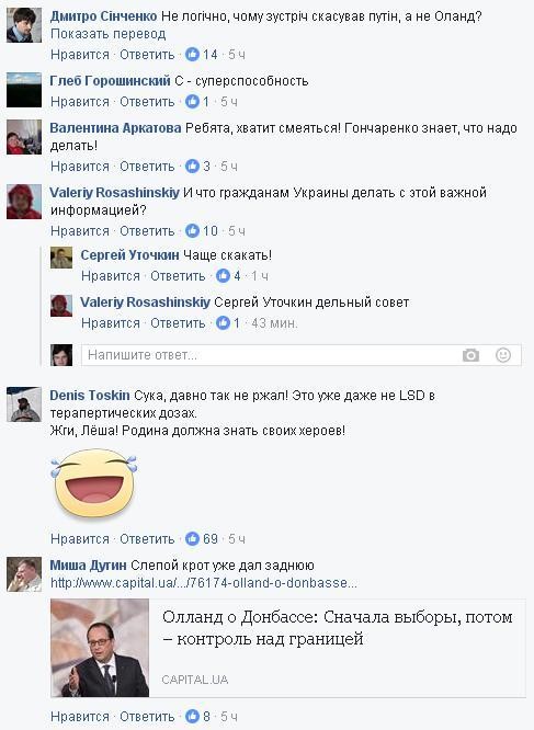 Впрочем, подписчики Алексея Гончаренко в социальных сетях восприняли новость без должного восхищения: многие указали на то, что информация о переносе встречи Путина и Олланда появилась в СМИ за несколько часов до сообщения Гончаренко. Впрочем, предлагаем просто насладиться комментариями на страничке политика.