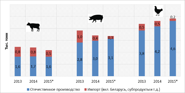 Кстати, каждый шестой-седьмой килограмм российского мяса производится в одной маленькой Белгородской области, а потому вполне логично, что оно в первую очередь оказывается на рынках Харькова и других регионов Украины. Очевидно, что по говядине Россия еще некоторое время будет нетто-импортером.