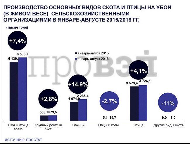 Согласно данным украинской статистики за первые 9 месяцев текущего года, при сохранении производства мяса (даже некотором росте) поголовье КРС упало на 3%, свиней – на 4%, птицы – на 2%. Это падение продолжалось весь 2014 и 2015 годы.