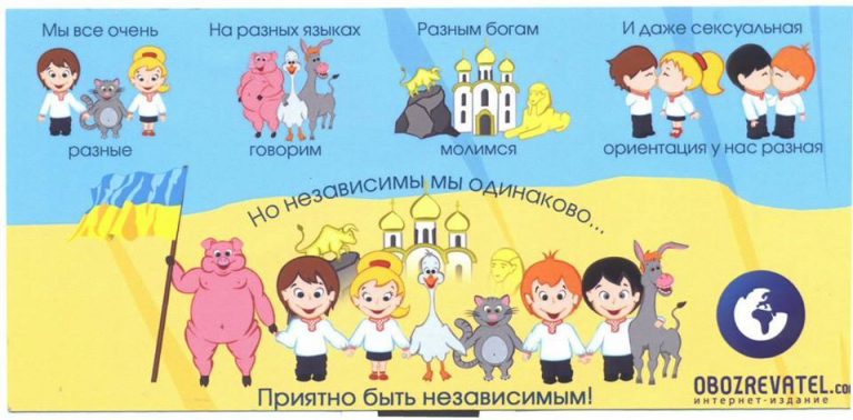 На картинке изображены вперемешку люди и животные, уверяющие в том, что несмотря на разницу в языке, религии, поле и возрасте, национальности, а также сексуальной ориентации, их объединяет то, что они все – “одинаково независимы”.