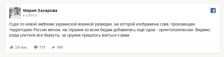 Спикер МИД России Мария Захарова сравнила появление на Украине совы с исчезновением беркутов.