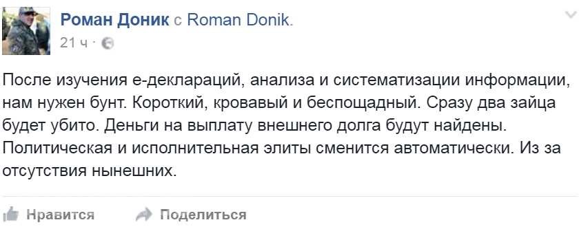 «После изучения е-деклараций, анализа и систематизации информации, нам нужен бунт. Короткий, кровавый и беспощадный. Сразу два зайца будет убито. Деньги на выплату внешнего долга будут найдены. Политическая и исполнительная элиты сменятся автоматически. Из-за отсутствия нынешних», — заявил он на своей странице в социальной сети.
