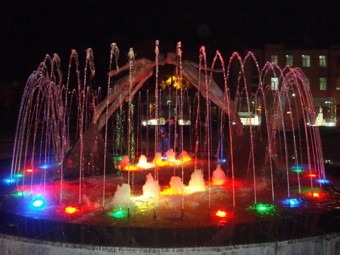 Зеркальная струя все такая же яркая и переливается различными цветами. Особенно доставляет желтая арка с голубой подсветкой и как апофеоз – украинский флаг на макушке фонтана.