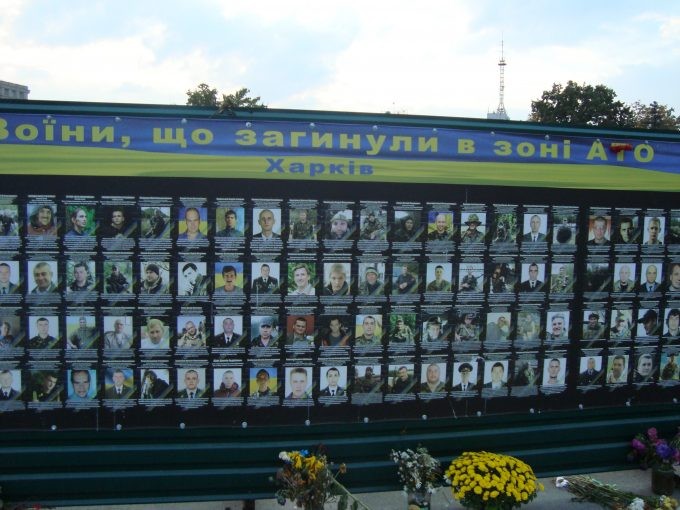 Вместо родного памятника, хотя я еще жила в Харькове, когда его свалили, сейчас забор с фотографиями погибших в АТО. Однако вместо снимков «храбрых харьковчан» по бокам зачем-то указаны Донецк и Луганск. То ли этот стенд разделен на три части по трем городам, то ли я просто не поняла задумку его создателя.