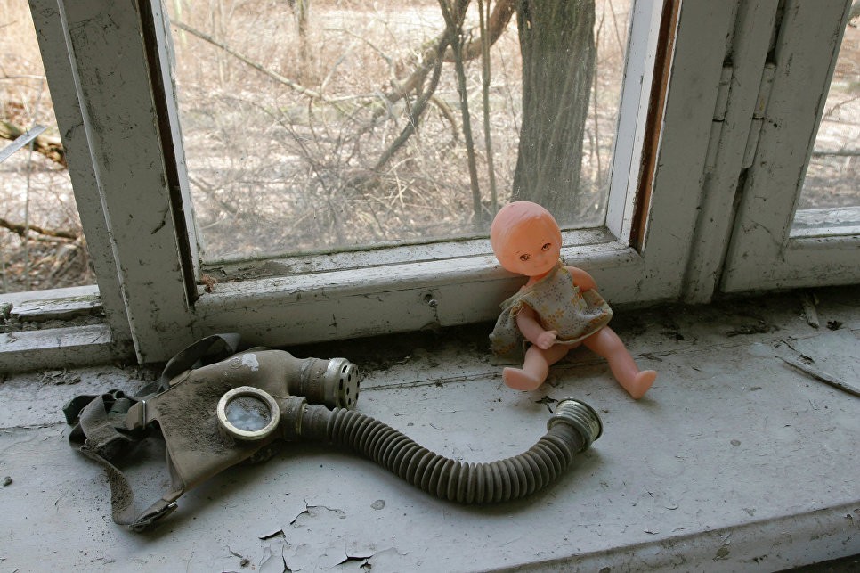Брошенные кукла и противогаз на подоконнике в бывшем детском саду города Припять