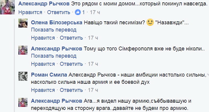 Белозерская попыталась утешить его и призвала перестать быть пессимистом, на что последовал ответ, что прежнего Симферополя «уже не будет никогда».Скептически оценил он и возможности украинской армии по возвращению Крыма.