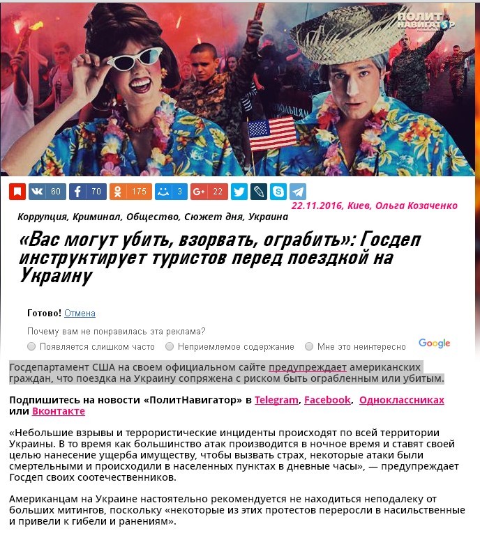 Буквально на днях Госдепартамент США на своем официальном сайте предупреждал американских граждан, что поездка на Украину сопряжена с риском быть ограбленным или убитым.