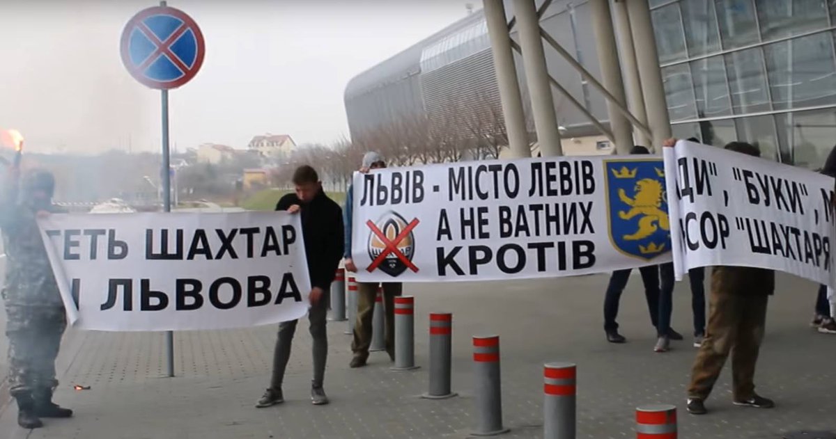 Пикетчики, большинство которых закрыла лицо масками, пришли с плакатами «Геть «Шахтар» зі Львова», а также «Львів — місто левів, а не ватних кротів». Некоторые участники акции зажгли файеры, а скандирование лозунгов происходило в момент, когда команда выходила из аэропорта и садилась в автобус. Источник