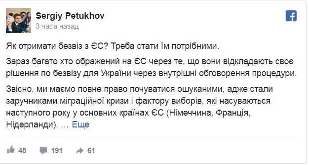 "Не секрет, что на принятие решения по Украине (по безвизу, – Ред.) во многом повлиял сирийский миграционный кризис. Именно побаиваясь негативной реакции избирателей на мигрантов, европейские лидеры не спешат давать безвиз Украине. А если это наша самая большая проблема, то именно она может стать решением! Я бы предложил ЕС взять на себя добровольно квоту на расселение мигрантов. Думаю, наша страна могла бы полностью взять на себя квоту, например, Нидерландов", – написал Петухов.