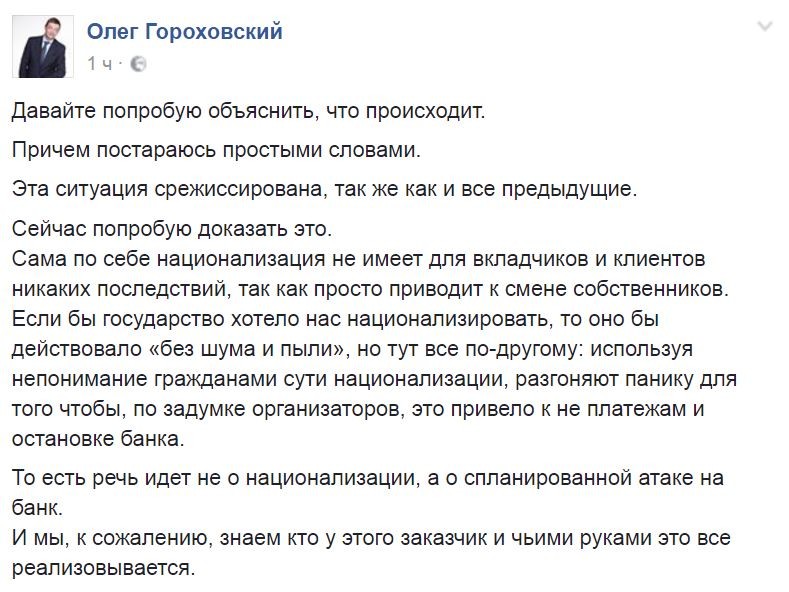 В тоже время в пресс-служба крупнейшего банка страны все отрицает, уверяя, что новая волна слухов - это четко спланированная информационная атака. "Сама по себе национализация не имеет для вкладчиков и клиентов никаких последствий, так как просто приводит к смене собственников. Если бы государство хотело банк национализировать, то оно бы действовало без лишней публичности. Здесь же все по-другому: используя непонимание гражданами сути национализации, разгоняют панику. И мы, к сожалению, знаем кто у этого заказчик и чьими руками это все реализовывается", - заявил первый зампредправления Приватбанка Олега Гороховского.