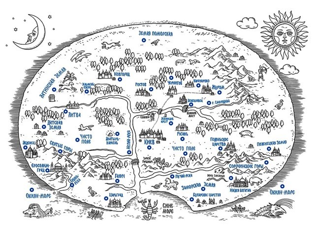 Это карта внутренняя. И те и другие названия смело можно разделить на «свои» (Русь), «чужие» (земли неверные, горы, лес, река) и «нейтральные» (поле, дорога, море, океан). В своих пространствах действуют богатыри, они там живут, но путешествуют в чужие пространства — за невестой, с целью собрать дань, повоевать. В чужих пространствах находятся враги — противники героя (Змей живет у реки, Соловей на заросшей лесом дороге), они приходят в пространства свои — захватить Русь, сжечь и проч. Внутри своих пространств могут локализоваться пространства чужие — в случае если там живет отрицательный персонаж (например, дом колдуньи Маринки Кайдаловны в Киеве). Нейтральные пространства — это места встречи своих героев, пространство, в котором происходит перемещение персонажей, место, где герои пробуют свои силы, отдыхают, разбивая шатер (дорога, поле). Конечно, эти точки могут пересекаться, их значения инвертироваться: свое пространство может стать чужим для героя, если он прибывает из своего города в центральную точку былинного мира (Дюк Степанович из Галича приезжает в Киев). И наоборот, если герой едет в чужую землю из Киева, то чужая земля приобретает черты своего пространства (в царстве Индейском герой сразу входит в гридню, видит лавки, красный угол). Кроме того, тексты фольклора существует в разных вариантах, так что и географическое пространство тоже меняется. Карта былинного мира — это исследовательское упражнение, помогающее хотя бы приблизительно представить, как понимали мир люди, которые пели былины.