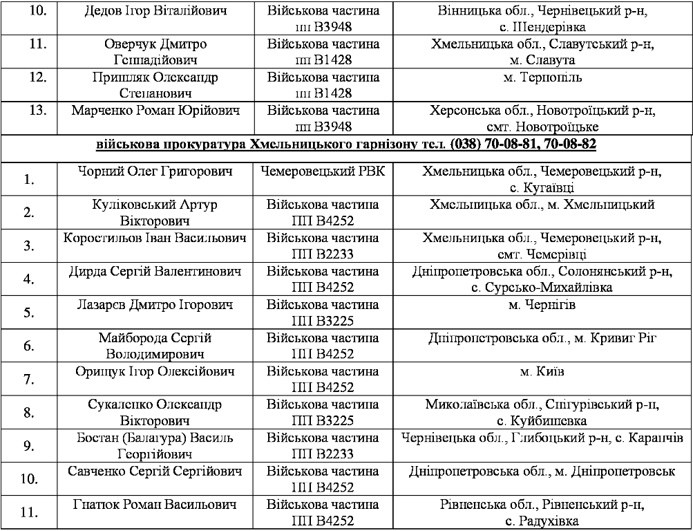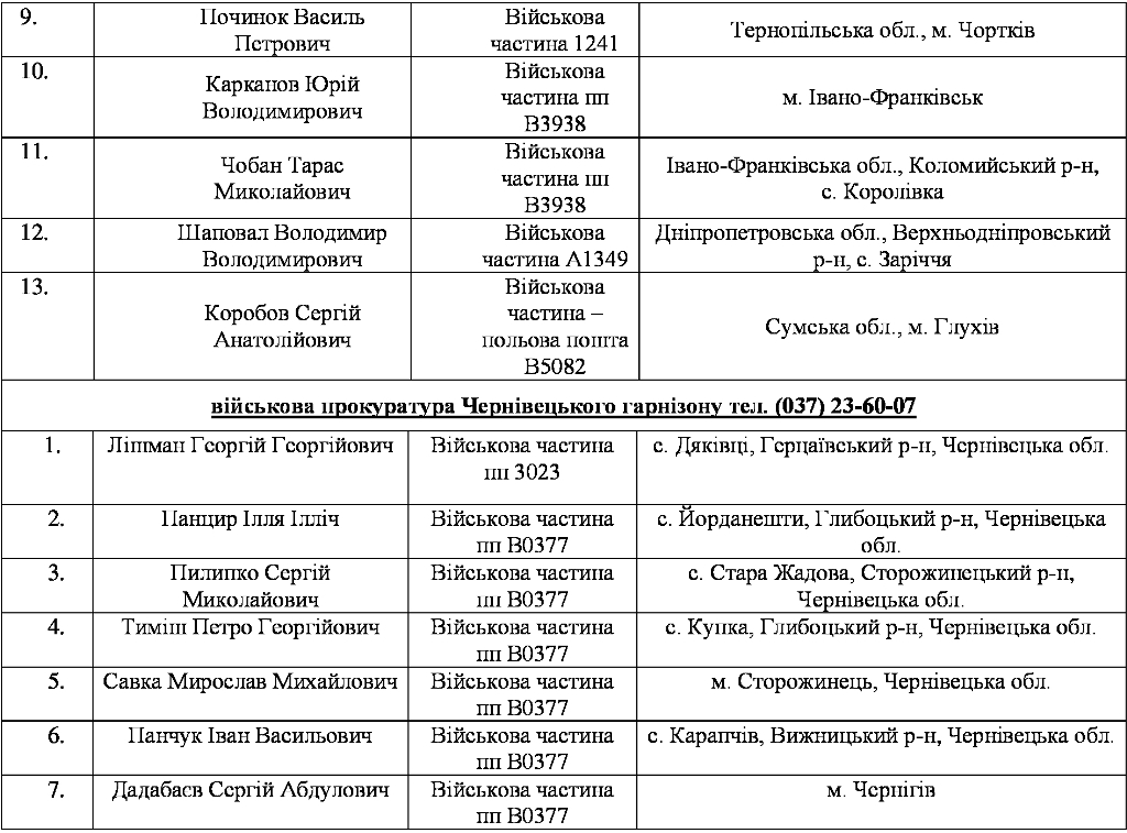 "с целью установления объективных обстоятельств и уважительности причин оставления воинских частей и мест службы обращаемся к гражданам с просьбой помочь установить местонахождение следующих лиц. С возникшими вопросами или любой информацией, которая поможет в установлении указанных обстоятельств, просим обращаться в военные прокуратуры гарнизонов Западного региона Украины по указанным в таблице телефонам.