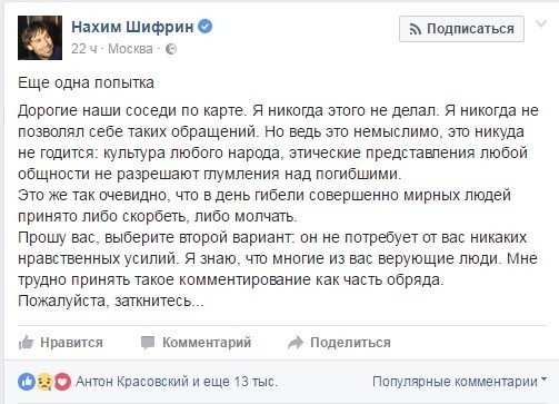 Что тут скажешь. Только можно развести руками и посетовать на полное отсутствие человеческого сострадания к тем, кто испытывает сегодня боль утраты. Именно это попробовал объяснить им известный артист Ефим Шифрин, поскольку тоже не выдержал.