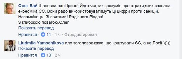 В частности, Геращенко опубликовала на своей страничке ссылку с украинского издания «Экономическая правда под заголовком «Санкции против России стоили ЕС 17,6 миллиардов евро в 2015 году» и сопроводила эту ссылку собственным комментарием: