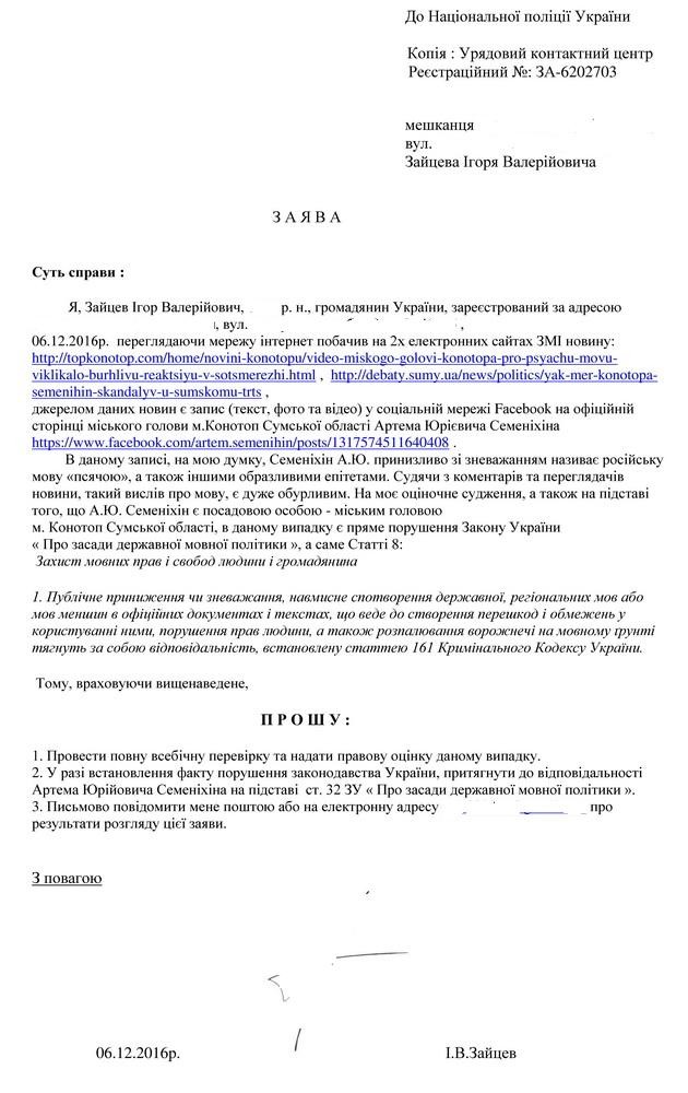 В начале декабря, просматривая новостные сайты наткнулся на очень «любопытную» новость о том, что городской голова г.Конотоп Сумской области Семенихин А.Ю. вытворяет в г.Сумы и называет русский язык «псячою мовою». А дальше ссылки на происходящее (видео присутствует). Я человек не злобный, но у всего есть пределы — поэтому написал заявление на «это».