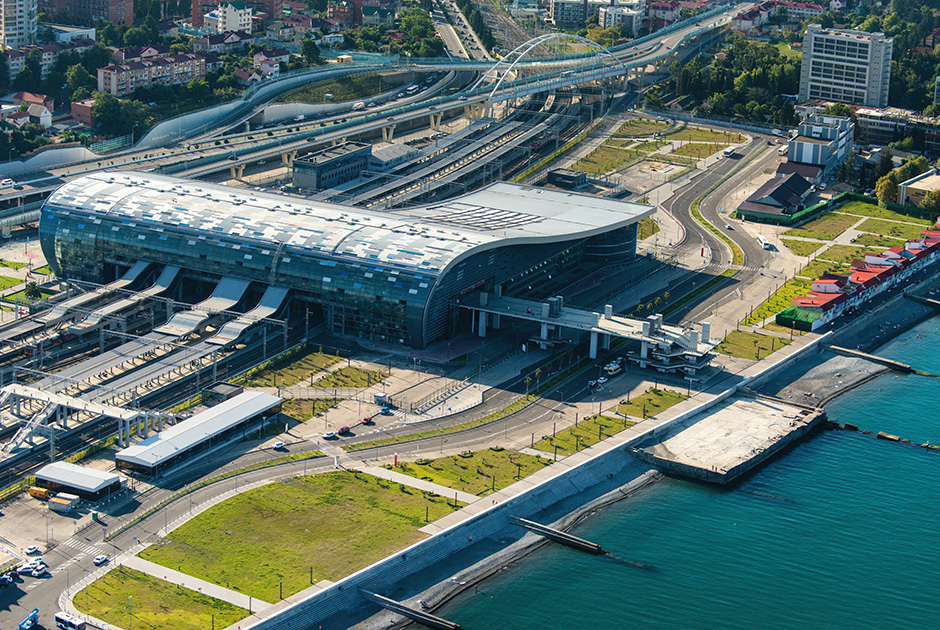 Проект был разработан НПО «Мостовик» совместно с немецким архитектурным бюро GMP. Здание разделено на морскую и городскую части. На кровле автостоянки установлены солнечные батареи. Вокзал обслуживает три-пять тысяч пассажиров в час, а в день открытия Олимпийских игр нагрузка возросла до 20 тысяч пассажиров в час