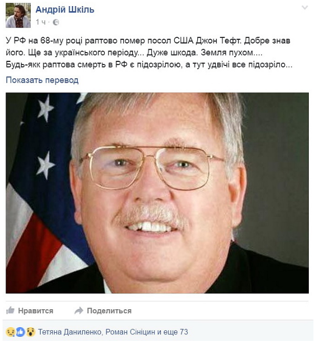 Сообщение украинского политика Андрея Шкиля о смерти в Москве посла США Джона Теффта, ранее работавшего в Киеве, не соответствует действительности.