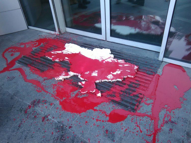 Возле входа в финучреждения националисты разливают красную краску, символизирующую кровь, а также клеят стикеры с призывами бойкотировать российские банки.