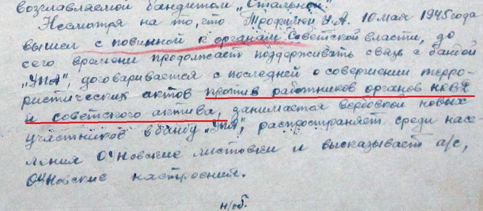 «Так вот я проверил. И скажу вам, львиная доля этих бумаг не имеет ровным счетом никакого отношения к несуществующей борьбе УПА с нацистами. К примеру, 6 из этих 61 документов — это дело бандеровца Трофимца, сдавшегося советской власти в мае 1945 г. Ни в одном из этих материалов нет ни слова о его или его банды участии в каких-либо стычках против немцев. Наоборот, обвинен он был в том, что обговаривал с УПА теракты «против работников органов НКВД и советского актива», за что ему в итоге дали 10 лет», — указывает политолог.