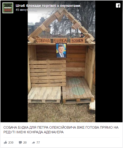 "Собачья будка Петра Алексеевича уже готова прямо на редуте имени Конрада Аденауэра", — сообщили радикалы на своей странице в Facebook. Также на странице размещено фото строения из деревянных досок и поддонов, на котором висит портрет Порошенко и надпись "собачья будка Roshen".