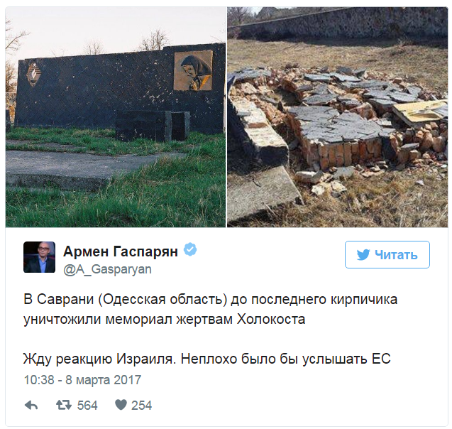 По его словам, мемориал на Еврейском кладбище неизвестные разбили на мелкие кусочки, до самого мелкого кирпича.