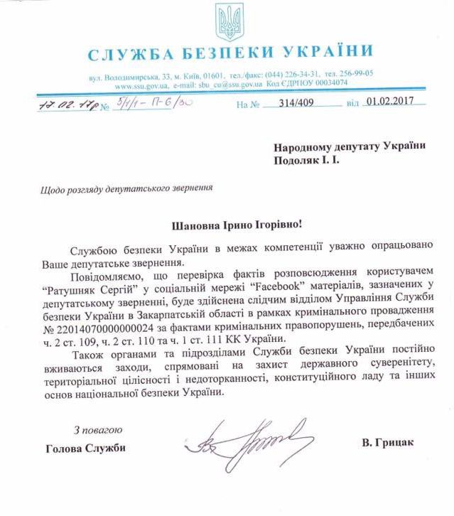 В ответе СБУ, фото которого размещено на странице Подоляк, говорится, что проверка фактов распространения Ратушняком материалов, указанных в депутатском обращении, будет осуществляться в рамках уголовного дела следственным отделом управления СБУ в Закарпатской области.